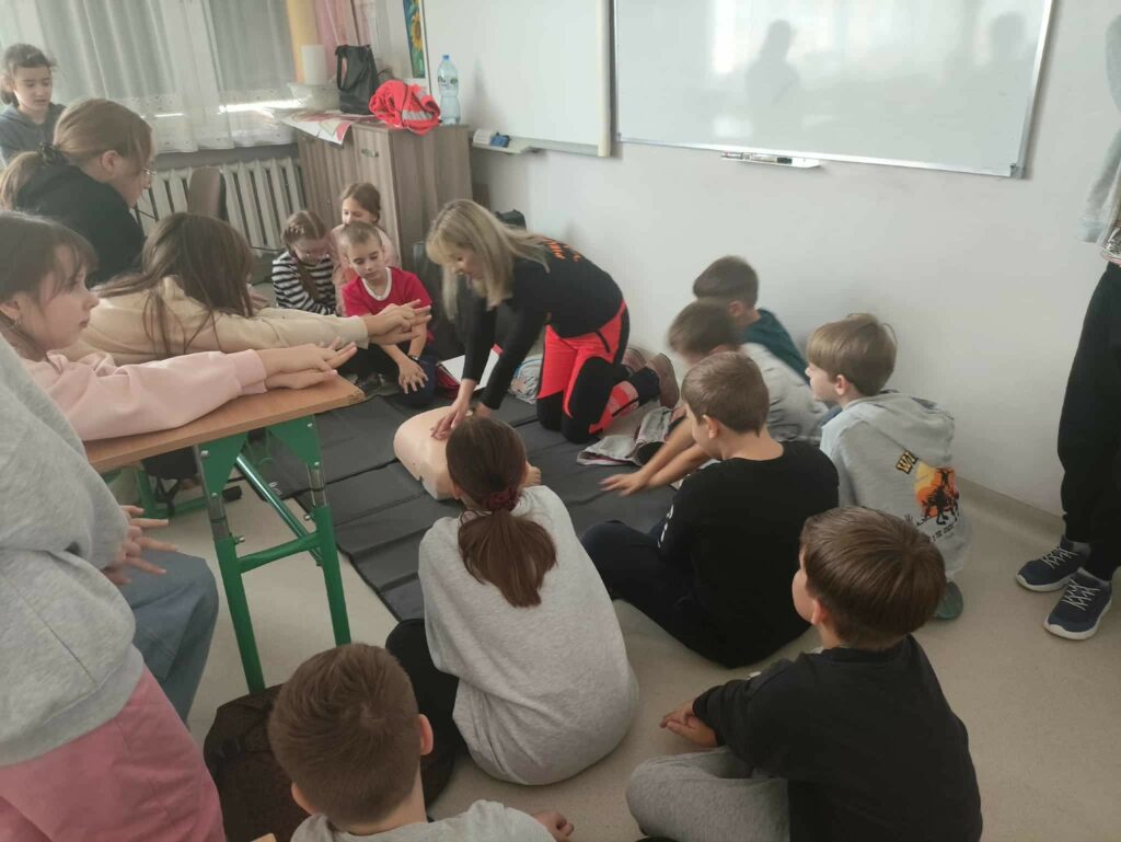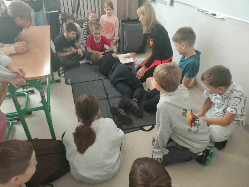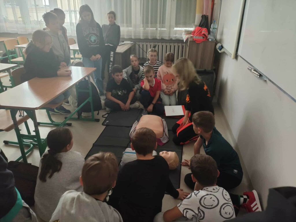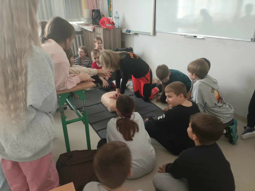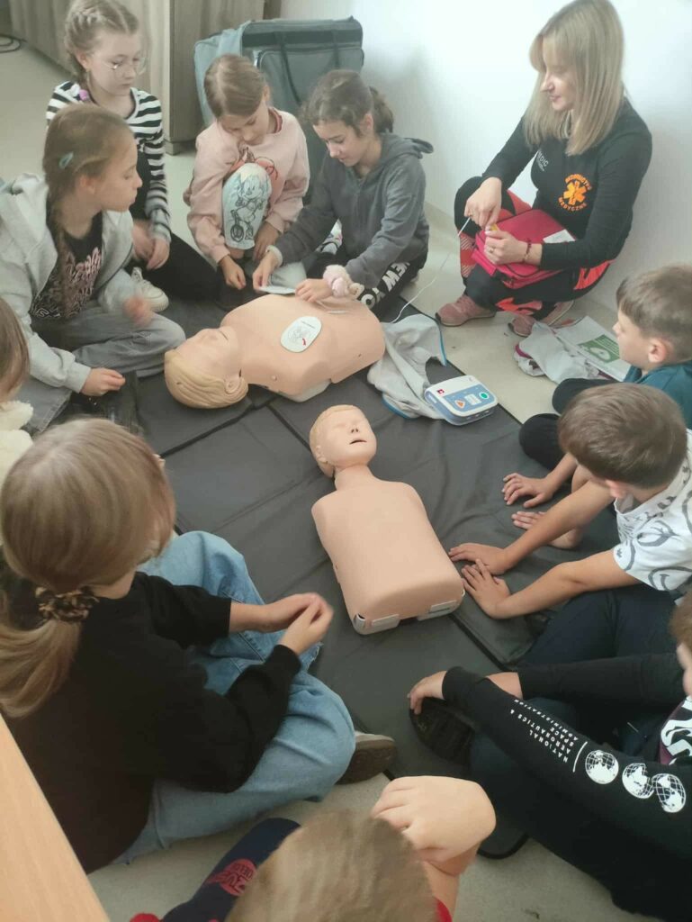W związku z przypadającym na 16 października Europejskim Dniem Przywracania Czynności Serca październikowym gościem była p. Magdalena Świszczorowska-Szewczyk – dyrektor firmy i transportu medycznego M-Medic. Pani Magda przeprowadziła pogadankę i warsztaty pod hasłem „Pierwsza pomoc zawsze w modzie”. Zajęcia miały na celu nauczenie dzieci podstaw udzielania pierwszej pomocy przedmedycznej oraz kształtowanie odpowiednich postaw w sytuacjach zagrożenia życia lub zdrowia. Podczas warsztatów uczniowie: • dowiedzieli się, jak rozpoznać osobę potrzebującą pomocy, • nauczyli się, jak prawidłowo wezwać pomoc, dzwoniąc pod numer 112, • ćwiczyli układanie poszkodowanego w pozycji bocznej bezpiecznej oraz chwyt Heimlicha, • poznali zasady resuscytacji krążeniowo-oddechowej (RKO) na fantomie, • omówili sytuacje, w których należy zachować spokój i zadbać o własne bezpieczeństwo. Zajęcia miały charakter praktyczny i odbywały się w niezwykle przyjaznej atmosferze. Uczniowie z dużym zaangażowaniem uczestniczyli w ćwiczeniach, zadawali pytania i dzielili się swoimi doświadczeniami. Z pewnością wykształcili umiejętność udzielania pierwszej pomocy przedmedycznej, co może uratować życie i zrozumieli, że pomaganie jest zawsze w modzie!