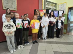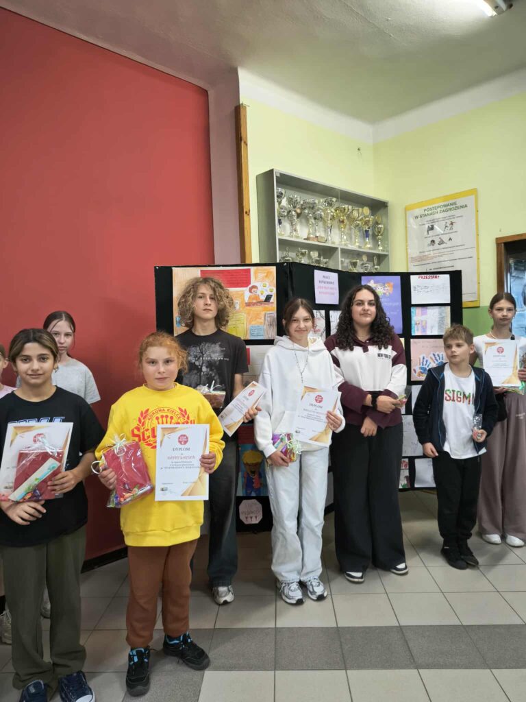 Liliana Jęczmińska i Oliwia Baraniecka z klasy 6a, Zuzanna Siudak, Maja Wójcik, Lena Jamrożek i Maja Nosek z klasy 8c, Antoni Borowiecki i Wiktor Piotrowski z klasy 5c.