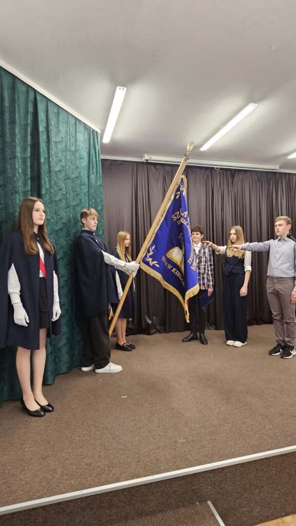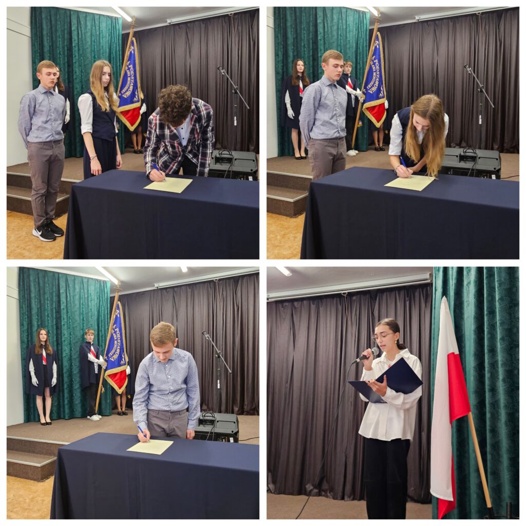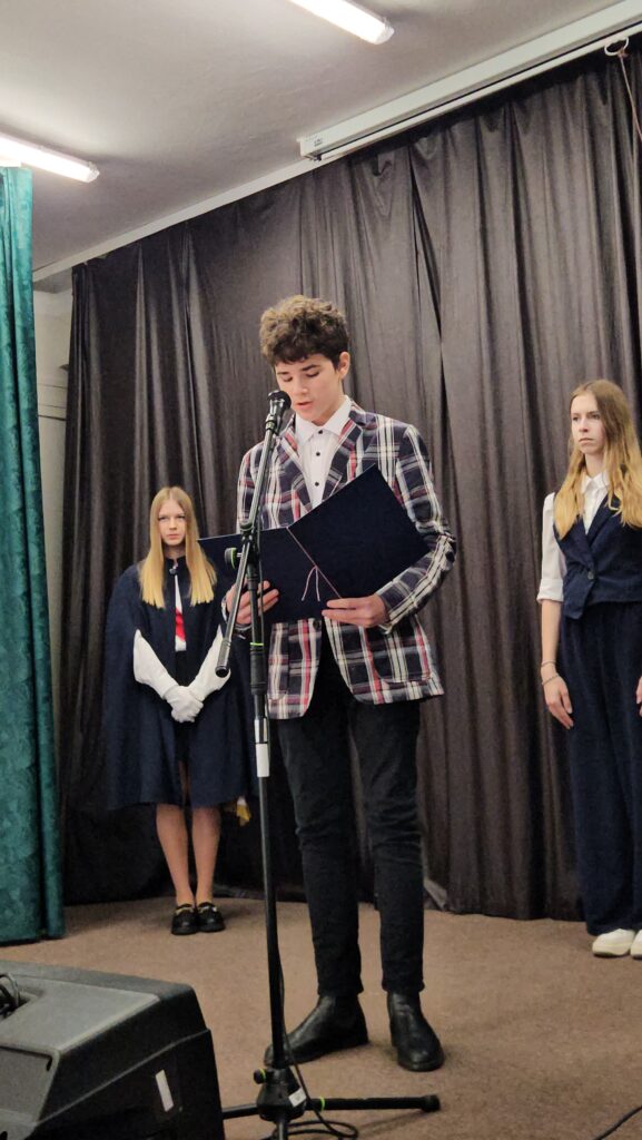 19 listopada 2025 r. w sali teatralnej odbyła się uroczystość zaprzysiężenia Samorządu Uczniowskiego. Po wprowadzeniu pocztu sztandarowego i odśpiewaniu hymnu państwowego przedstawiciele samorządu uroczyście złożyli ślubowanie, deklarując odpowiedzialność, zaangażowanie oraz działanie na rzecz społeczności szkolnej. Następnie podpisali Akt Ślubowania, potwierdzający ich gotowość do pełnienia powierzonych funkcji. Uroczystość miała podniosły i oficjalny charakter.