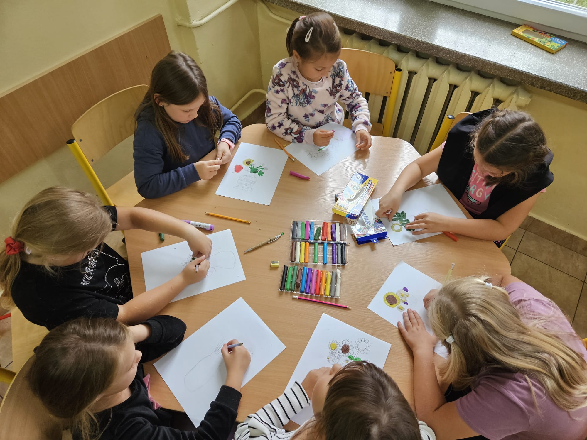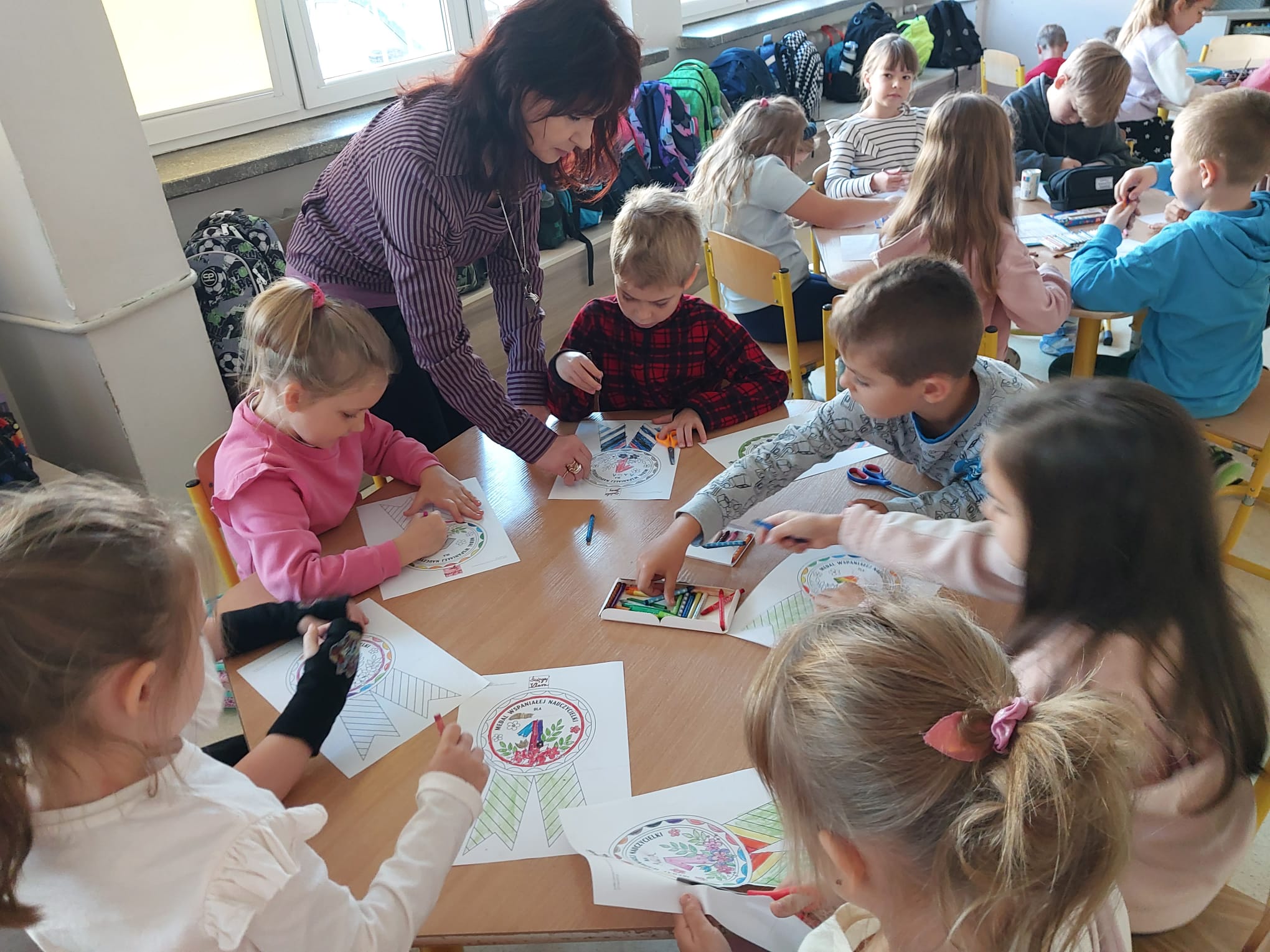 Podczas zajęć plastycznych mali artyści wykonali piękne prace związane z tematem dnia. Podjęte działania miały na celu kształtowanie więzi emocjonalnej między dziećmi a nauczycielami oraz budowanie postawy szacunku wobec wszystkich pracowników szkoły.