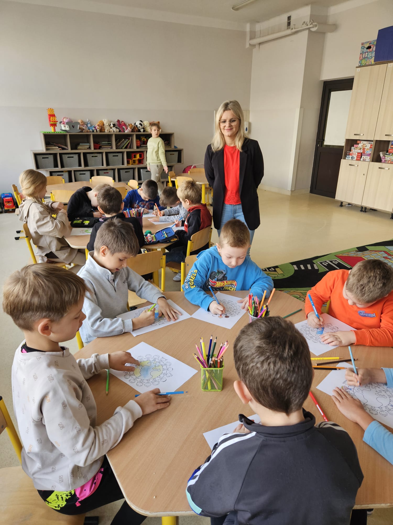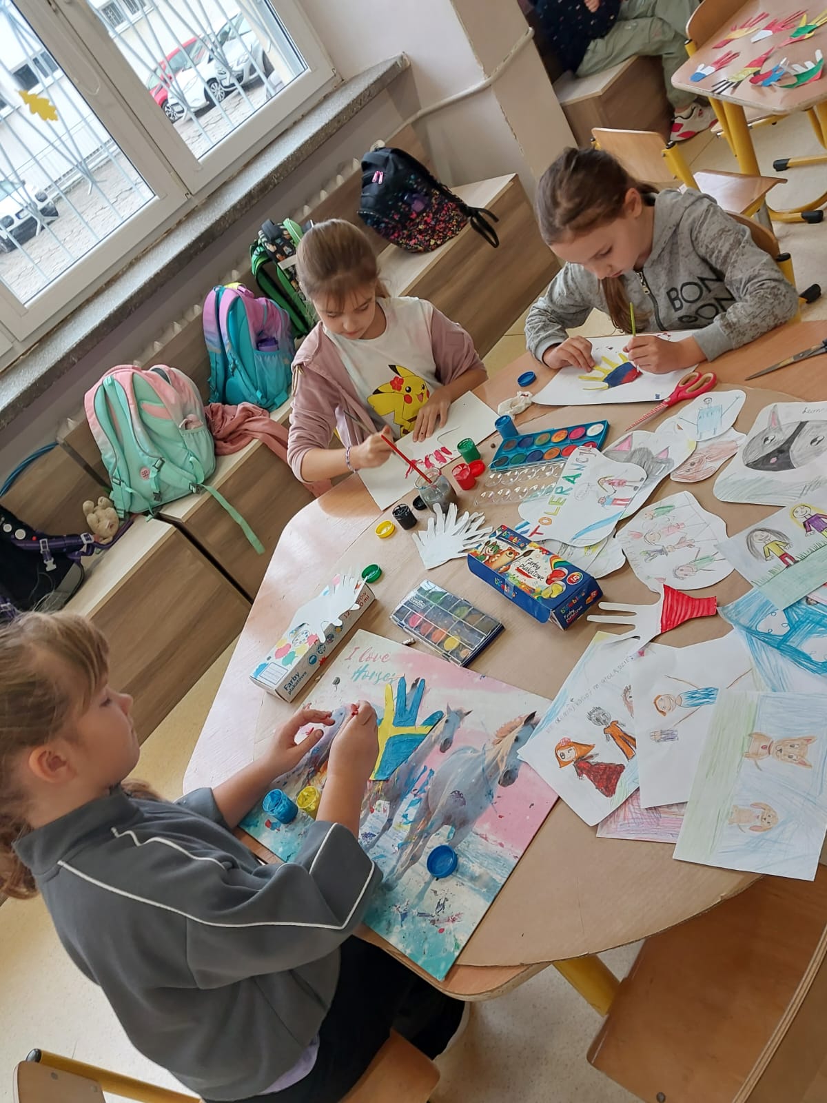 Nie zabrakło również wspólnego śpiewania – radośnie wybrzmiała piosenka „Każdy jest inny”, idealnie wpisująca się w temat dnia. Na zakończenie zajęć dzieci przygotowały piękne prace plastyczne, którymi udekorowaliśmy szkolny korytarz.